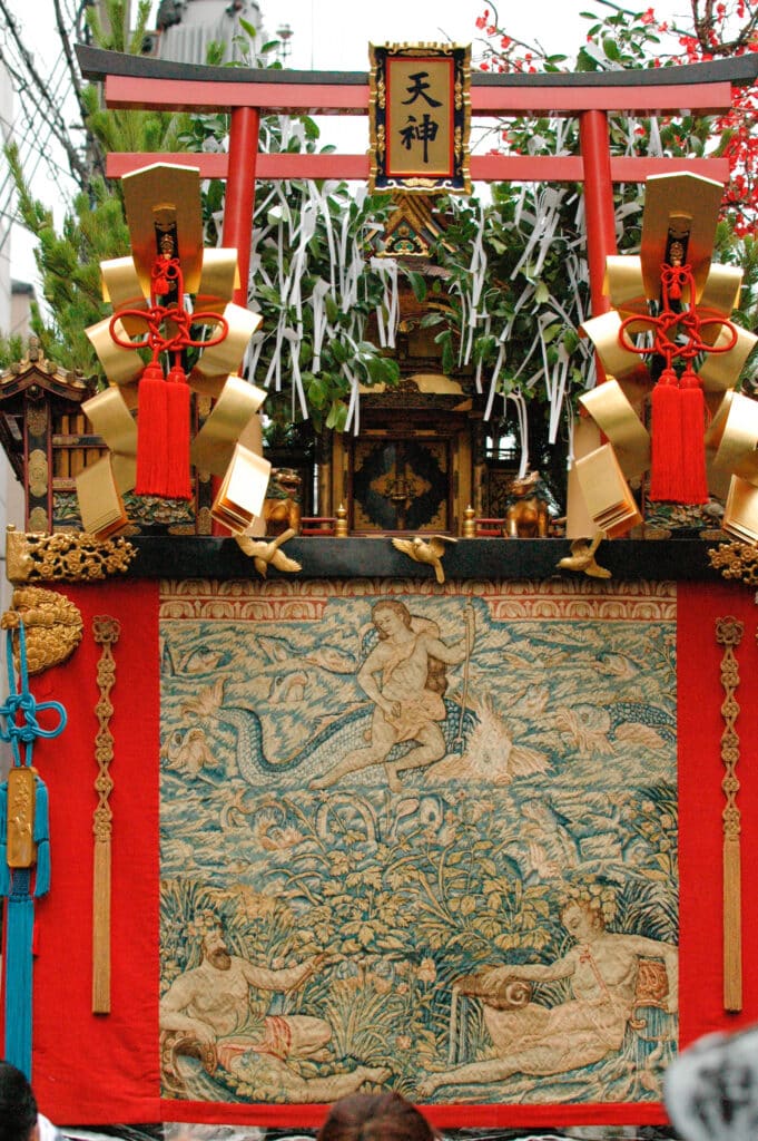 Arare Tenjin Yama is dedicated to “Tenjin-sama,” or the “Thunder Deity,” as is Abura Tenjin Yama. As the deified form of virtuous 9th-century scholar and statesman Sugawara Michizane, modern Japanese pray to him as a god of education. History tells us that though Michizane was unjustly wronged, he suffered with dignity, and after his death his enemies met with calamaties; for these reasons he presents an archetypal human experience that many can relate to. It’s estimated there are more than 35,000 Tenjin shrines throughout the country. “Arare” means “hail;” chōnai tradition holds that during a terrible fire in 1510, hail suddenly started to fall in this neighborhood, putting out the fire. Moreover, legend holds that a tiny statue of Michizane fell on the rooftops together with the hail, inspiring the neighborhood to dedicate this float to Tenjin-sama and the miraculous fire-quenching arare. The float miraculously survived the great fires of 1788 and 1864 that destroyed so many other floats (such as nearby Kikusui Boko); amulets sold here protect the bearer from fires and lightning.
